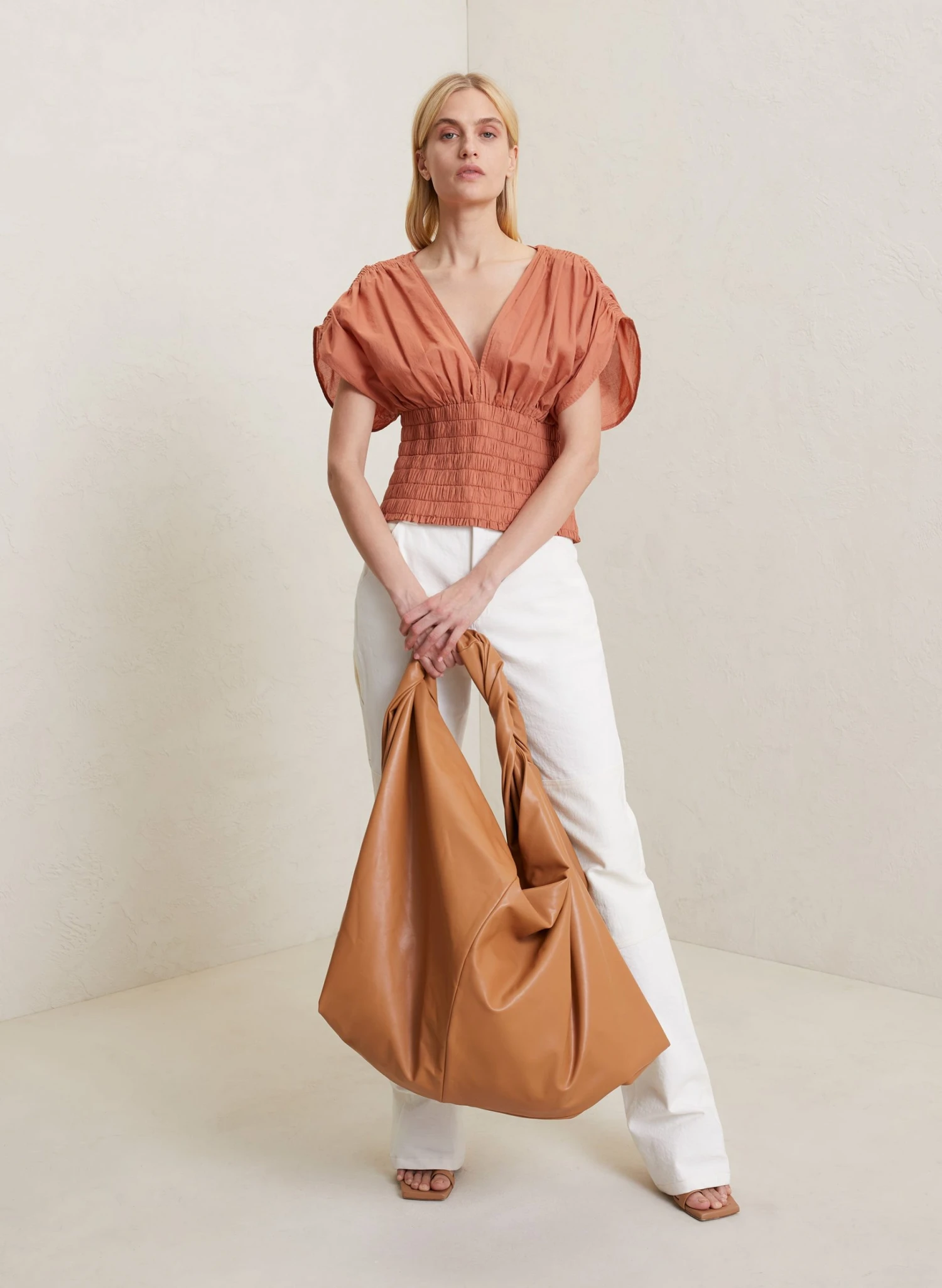 The Leo Bag is crafted from our softest vegan leather in a warm tan shade. This oversized silhouette features a soft and flexible shape and a woven handle to sling over your shoulder or carry loosely.