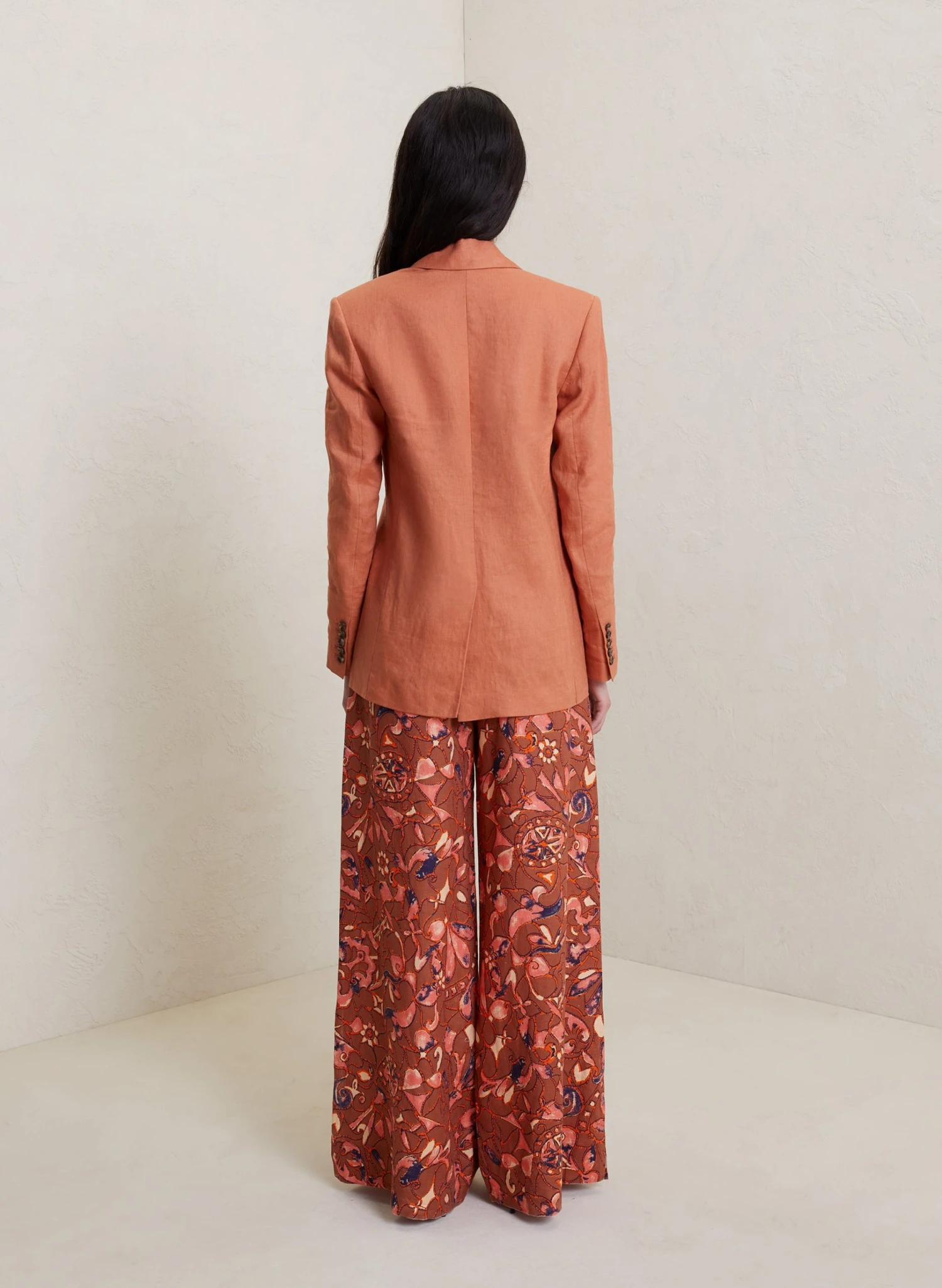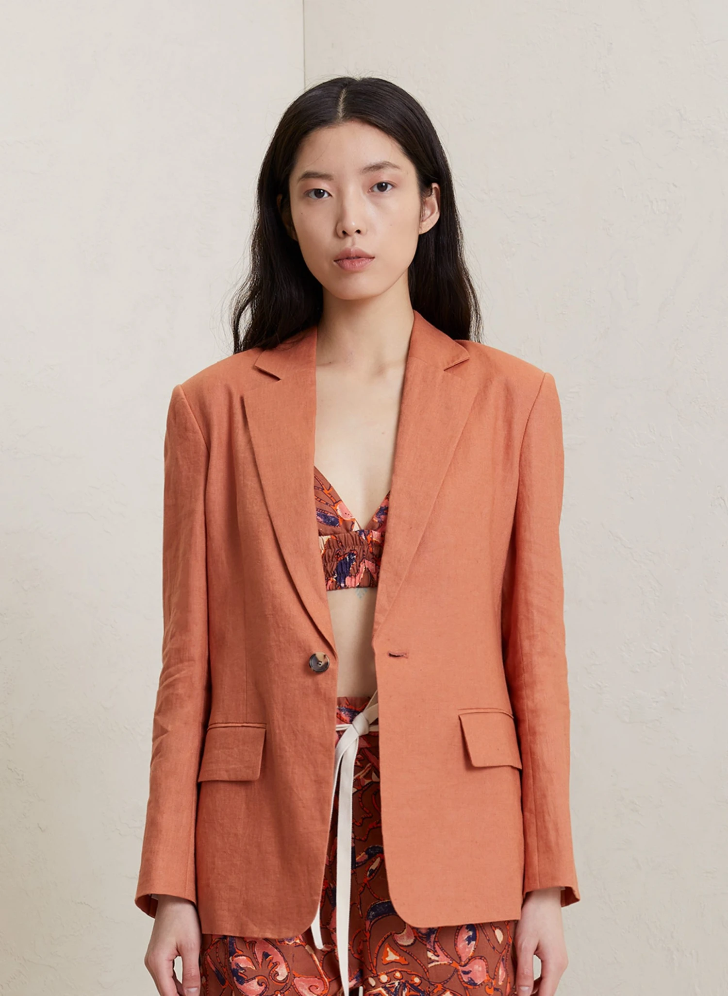 The Arlo Jacket is crafted from lightweight linen in a dusty coral hue. This relaxed silhouette features a pointed lapel and single button closure with flap pockets to finish.