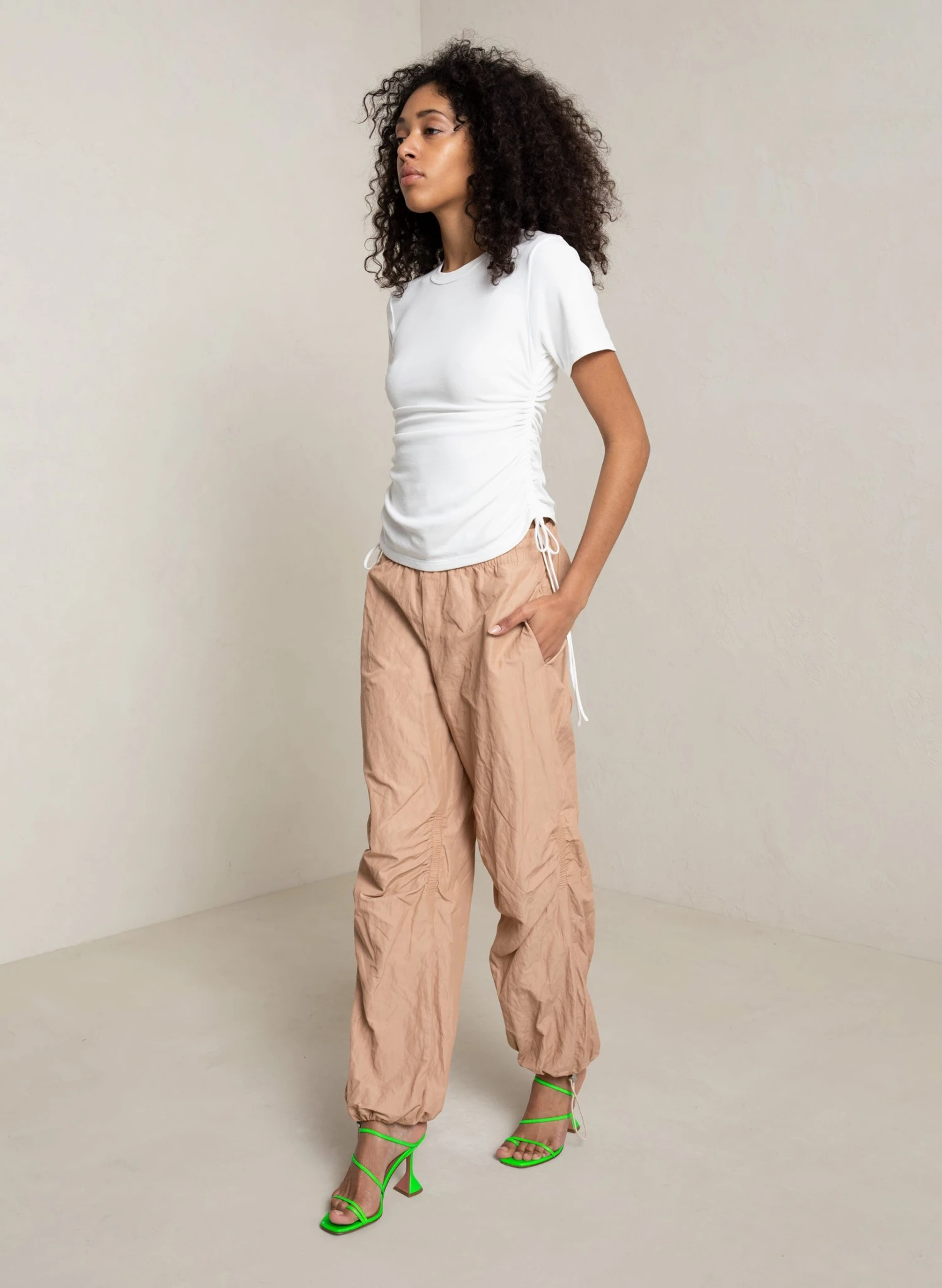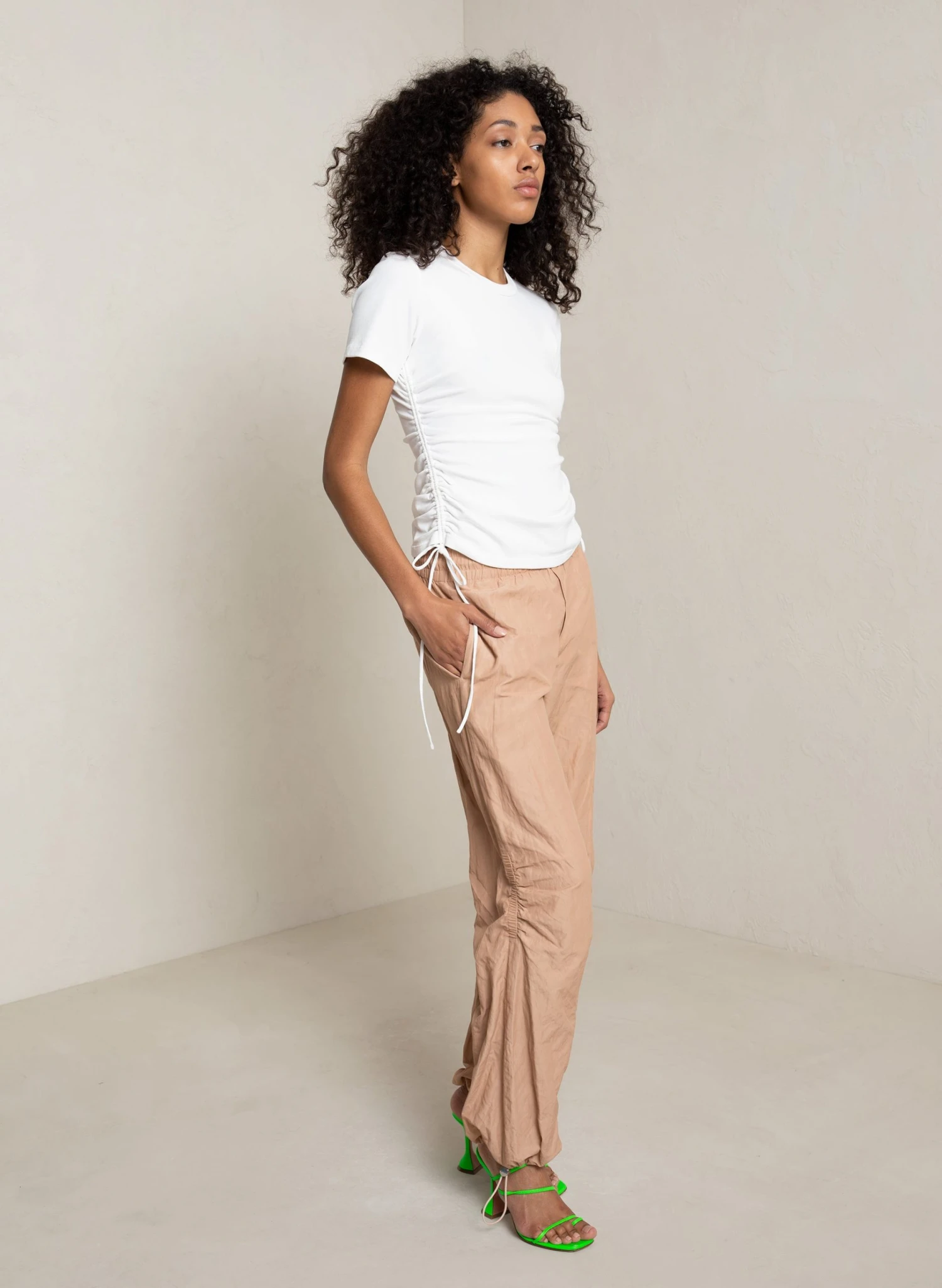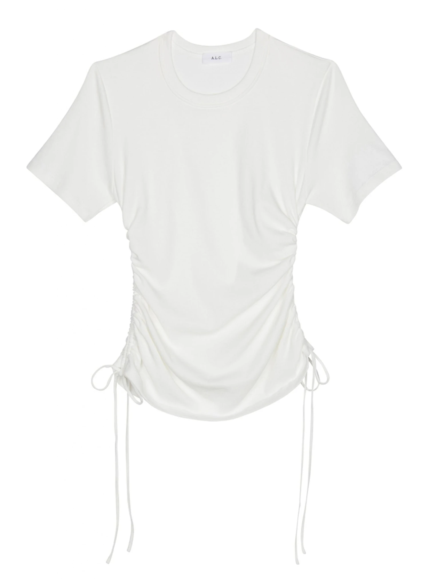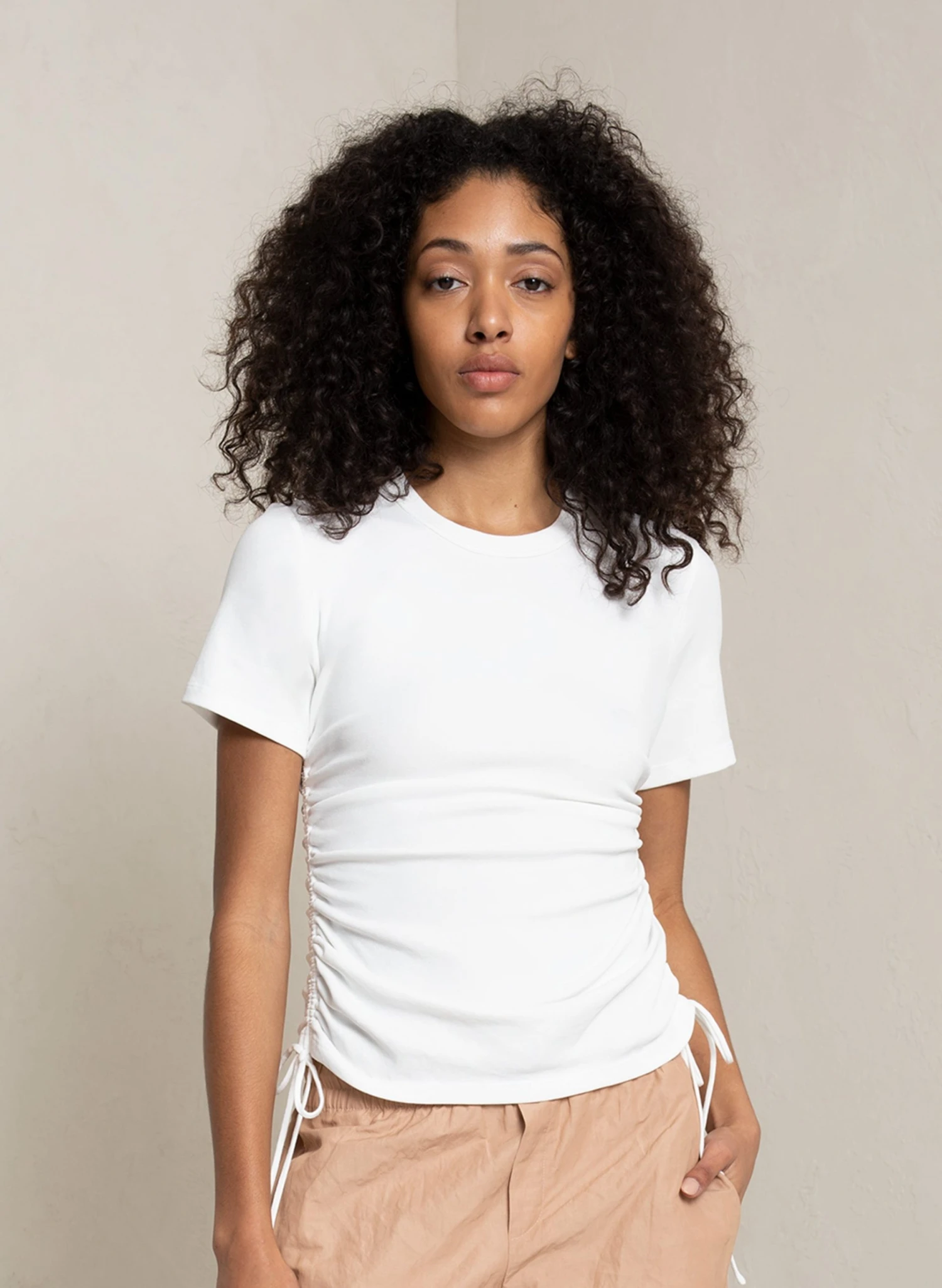 The Austin Tee is crafted from our soft vintage ribbed cotton in wardrobe-essential white. This crewneck silhouette features short sleeves and ruched detailing along the side to wear long or cropped.
