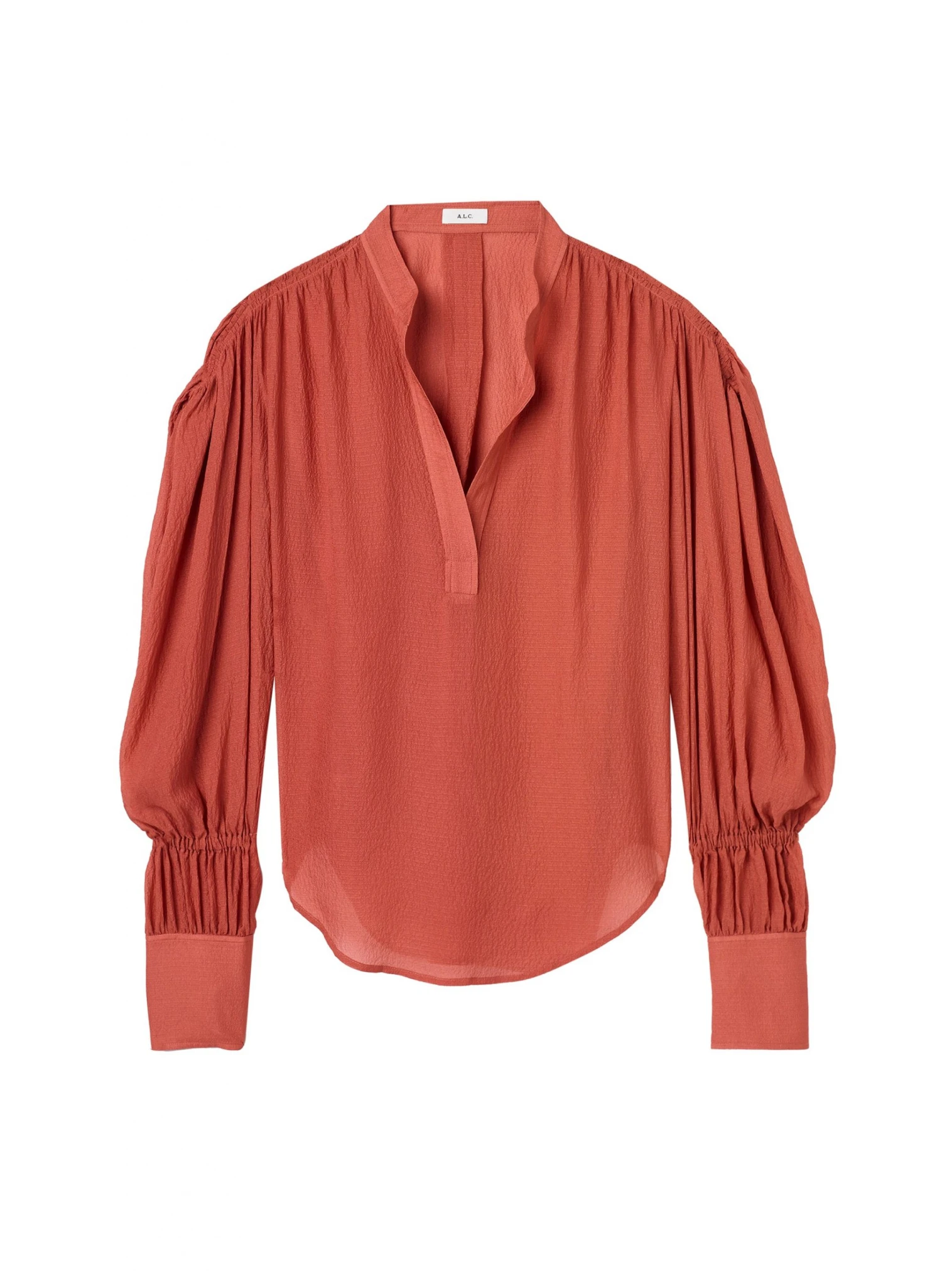 The Blake Top is crafted from hammered chiffon in a rust hue. This voluminous blouse features long Bishop sleeves with a clean mandarin collar and V-shaped neck. Shop Tops