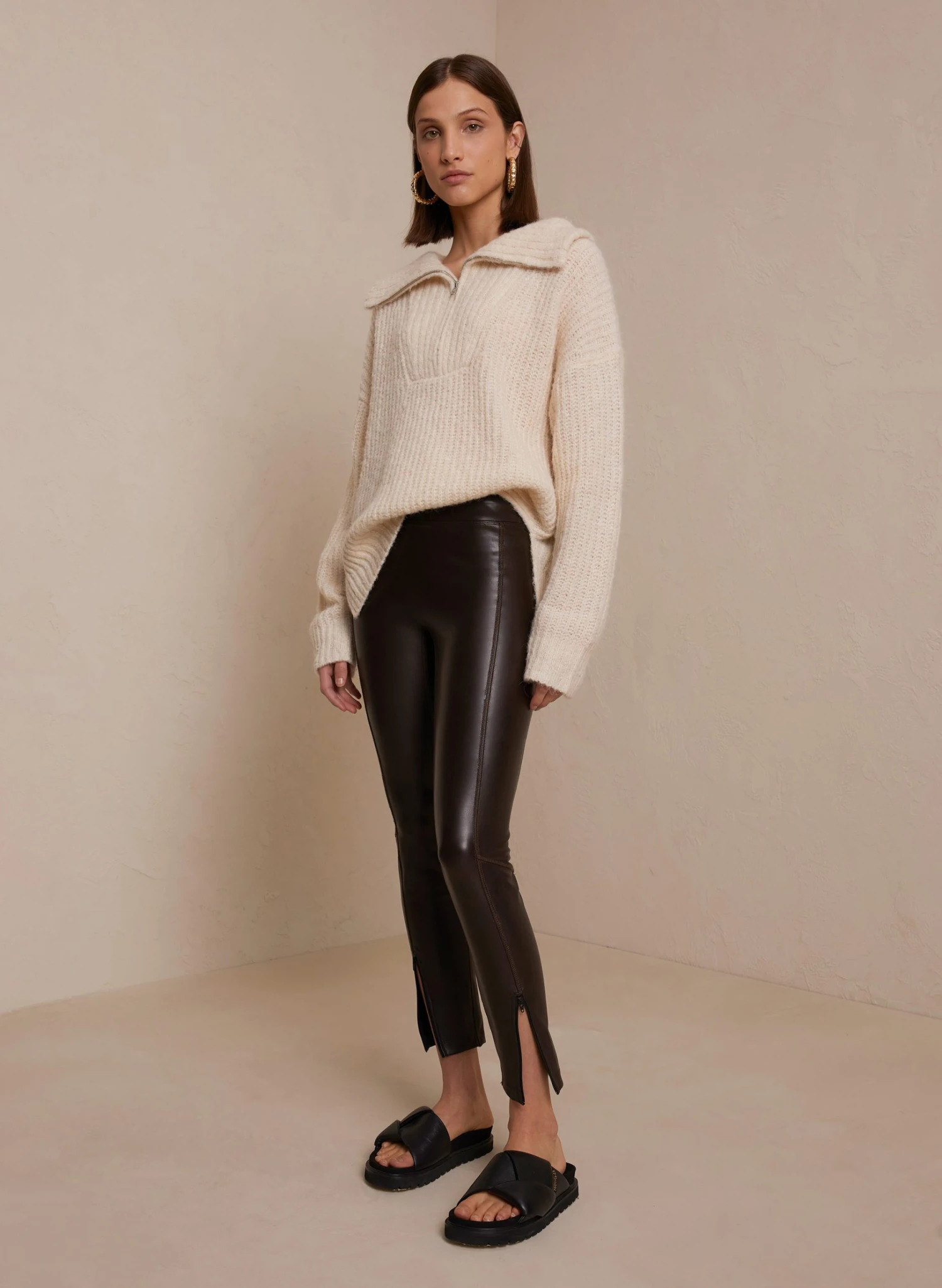 Ultra-comfortable yet effortlessly elevated, our stretch vegan leather leggings in a deep brown carob hue are an essential seasonal piece. Featuring a snug cropped fit that finishes with an adjustable ankle zip at the hem. Style runs small, we recommend ordering one size larger than your usual size.