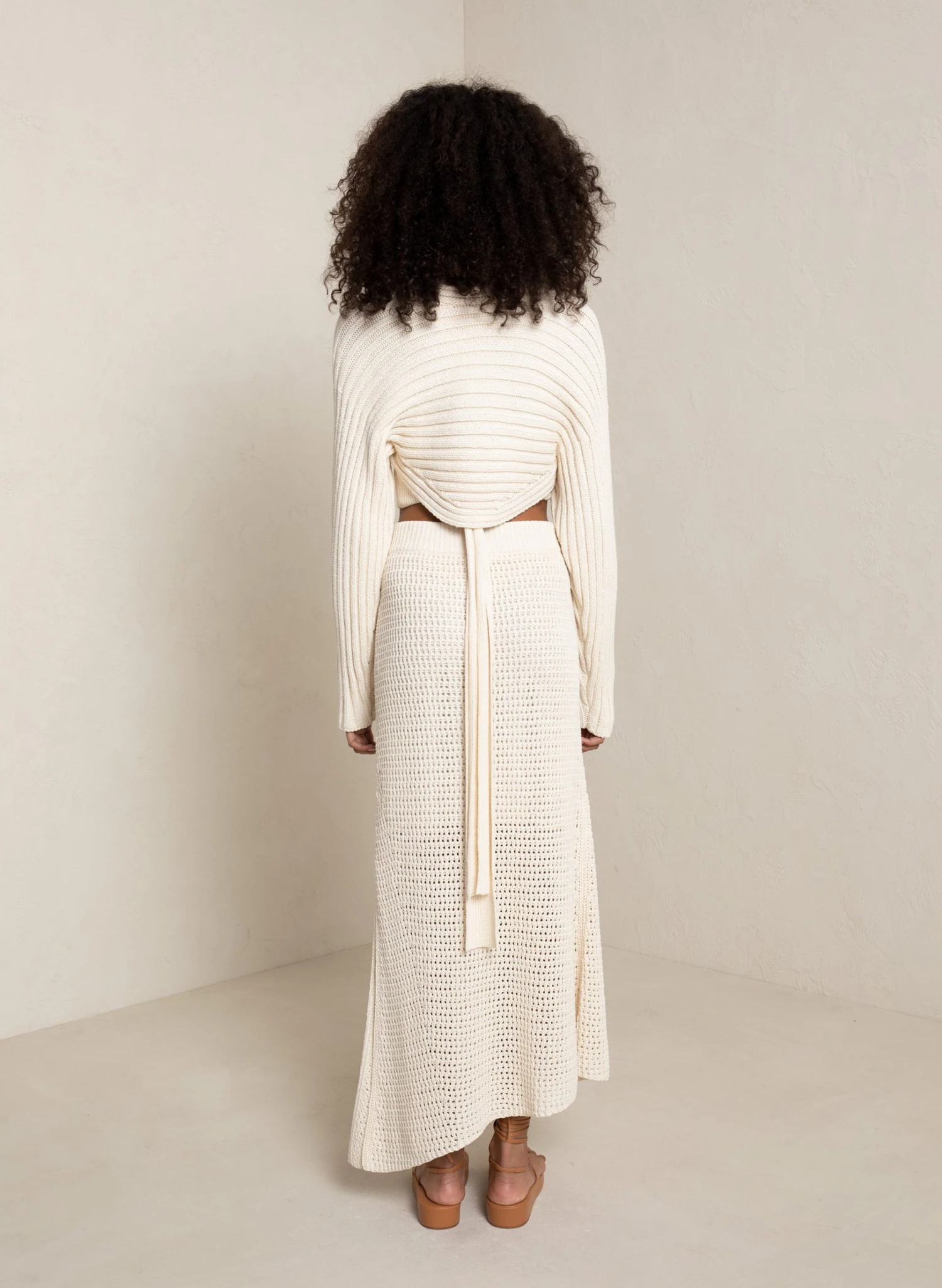 The Caleb Skirt is knitted from a cotton blend in an ivory hue. This maxi silhouette is partially lined, featuring an elasticized waist and side slit.