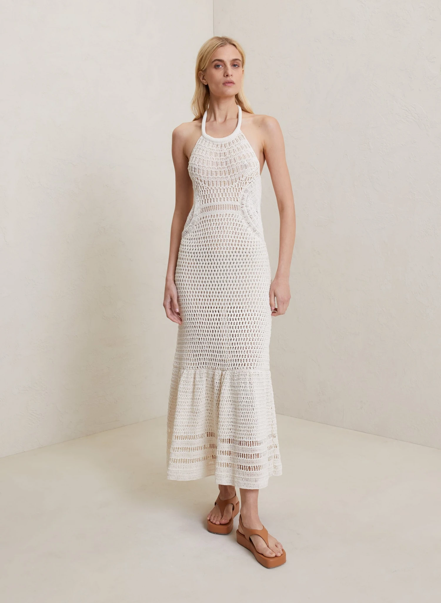 The Antonia Dress is knitted from 100% cotton in a summery off-white hue. This ankle-skimming silhouette is partially lined, with a halter neckline hem and tiered skirt.
