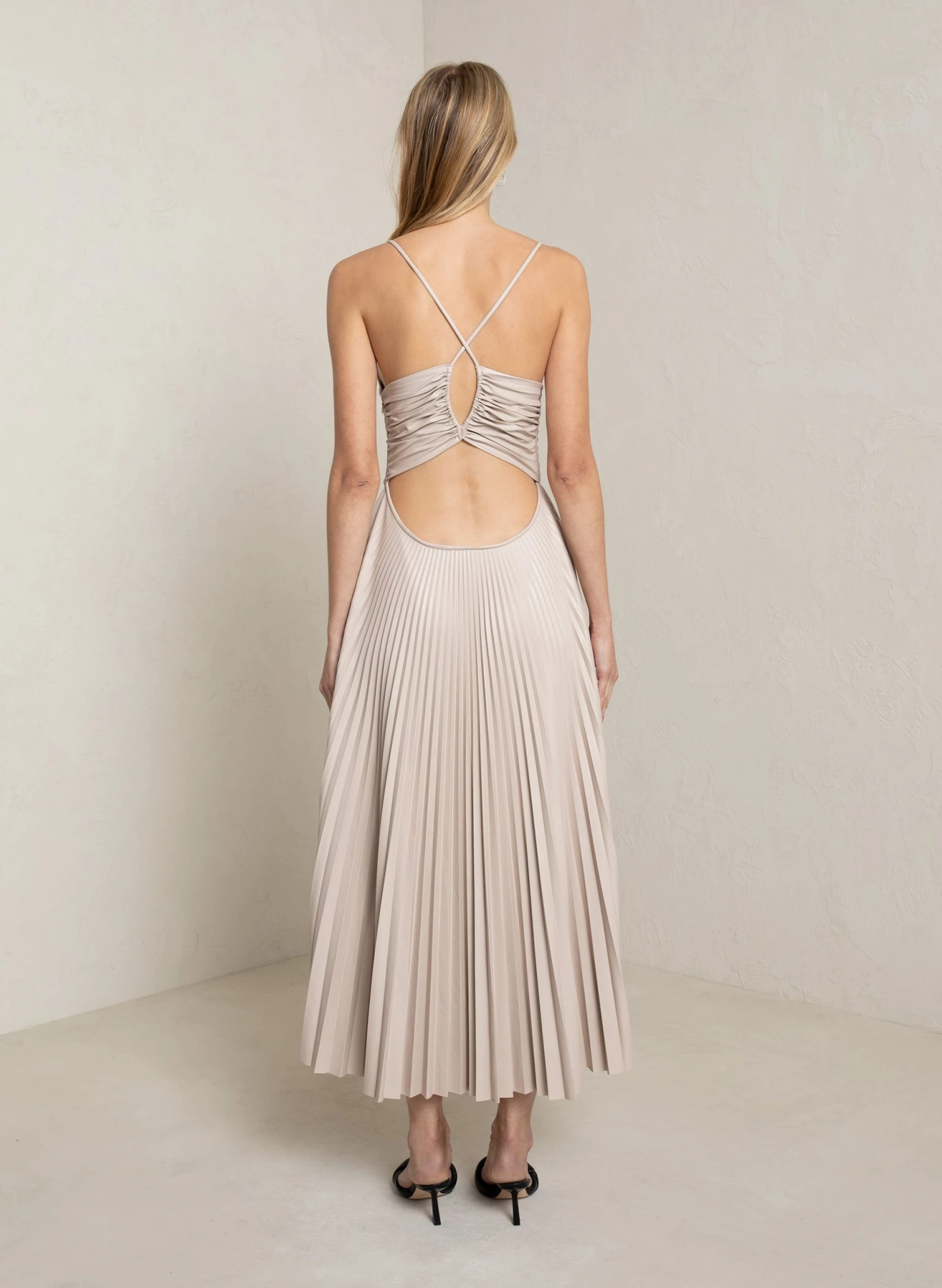 Designed to exude elegance, this midi-length pleated vegan leather dress features a fitted bodice, adjustable cross-back tie and ultra-skinny straps. Shop Dresses