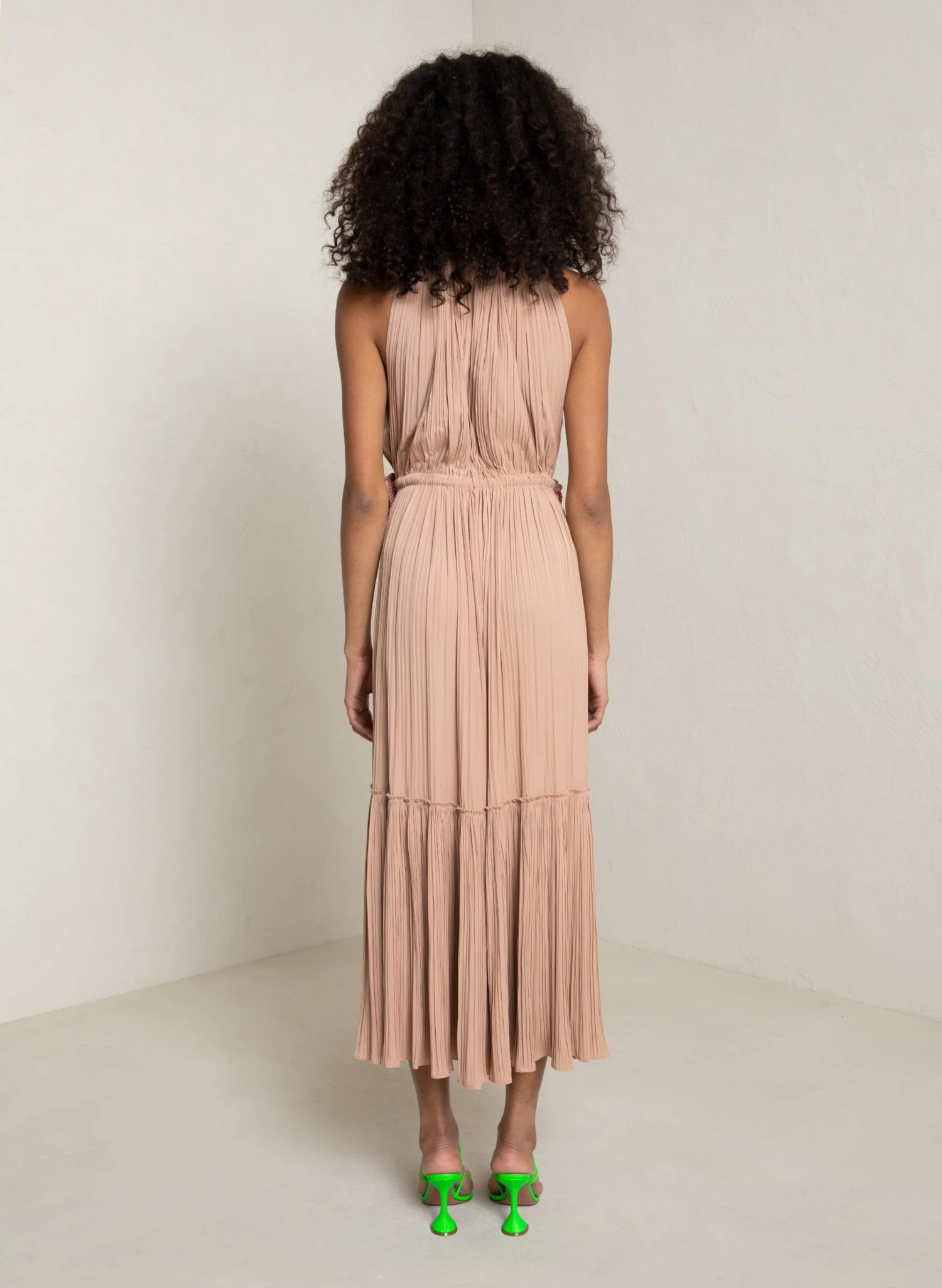 The Ella Dress features beautiful pleating that sways with every step in a dusty pink hue. This fluid midi silhouette features a halter neckline, tiered skirt, and draw cord waist to cinch as desired. Shop Dresses