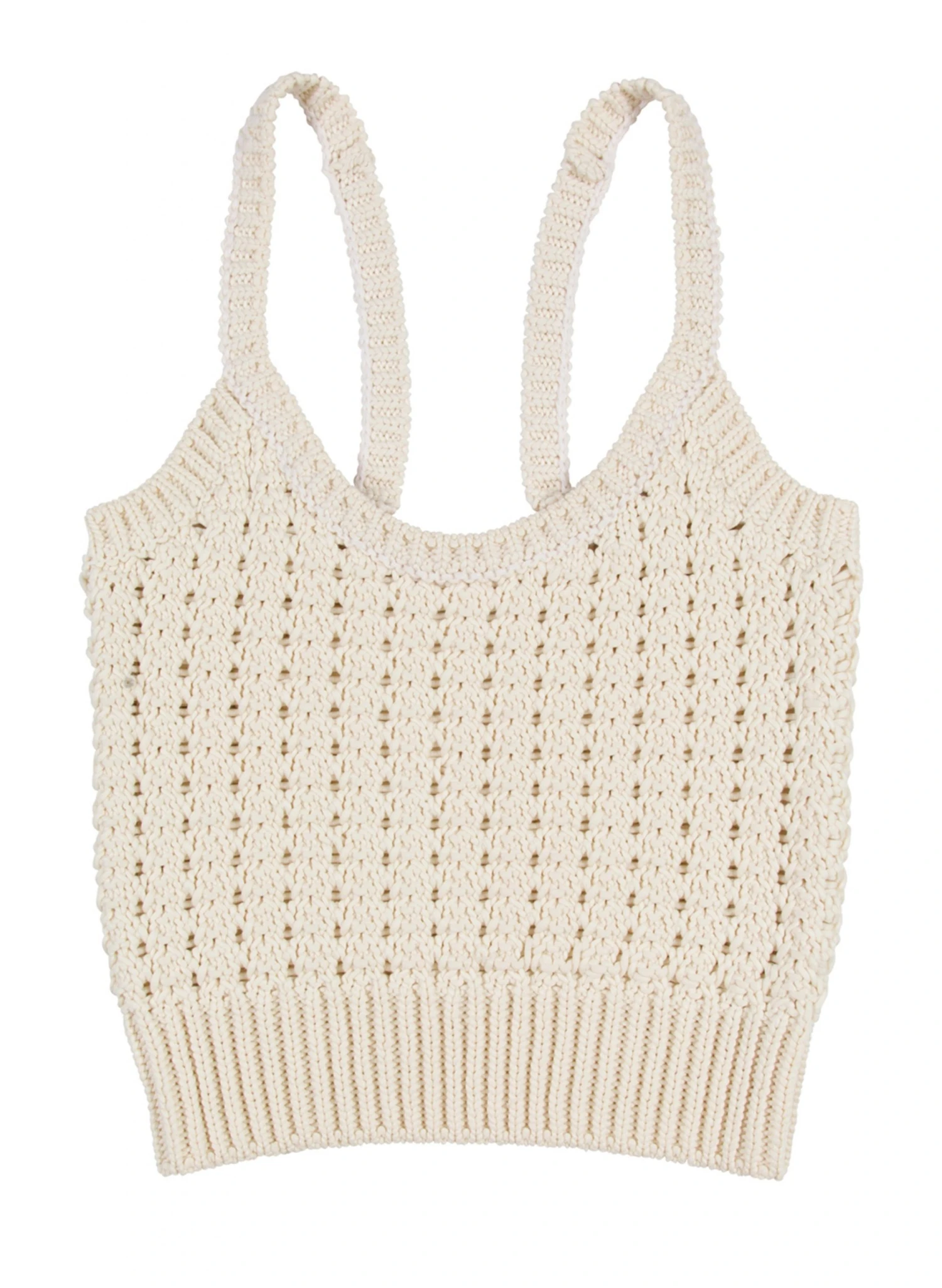 The Hadley Tank is knitted from 100% cotton in a creamy hue. This cropped silhouette features an open weave and scoop neckline with thick spaghetti straps.