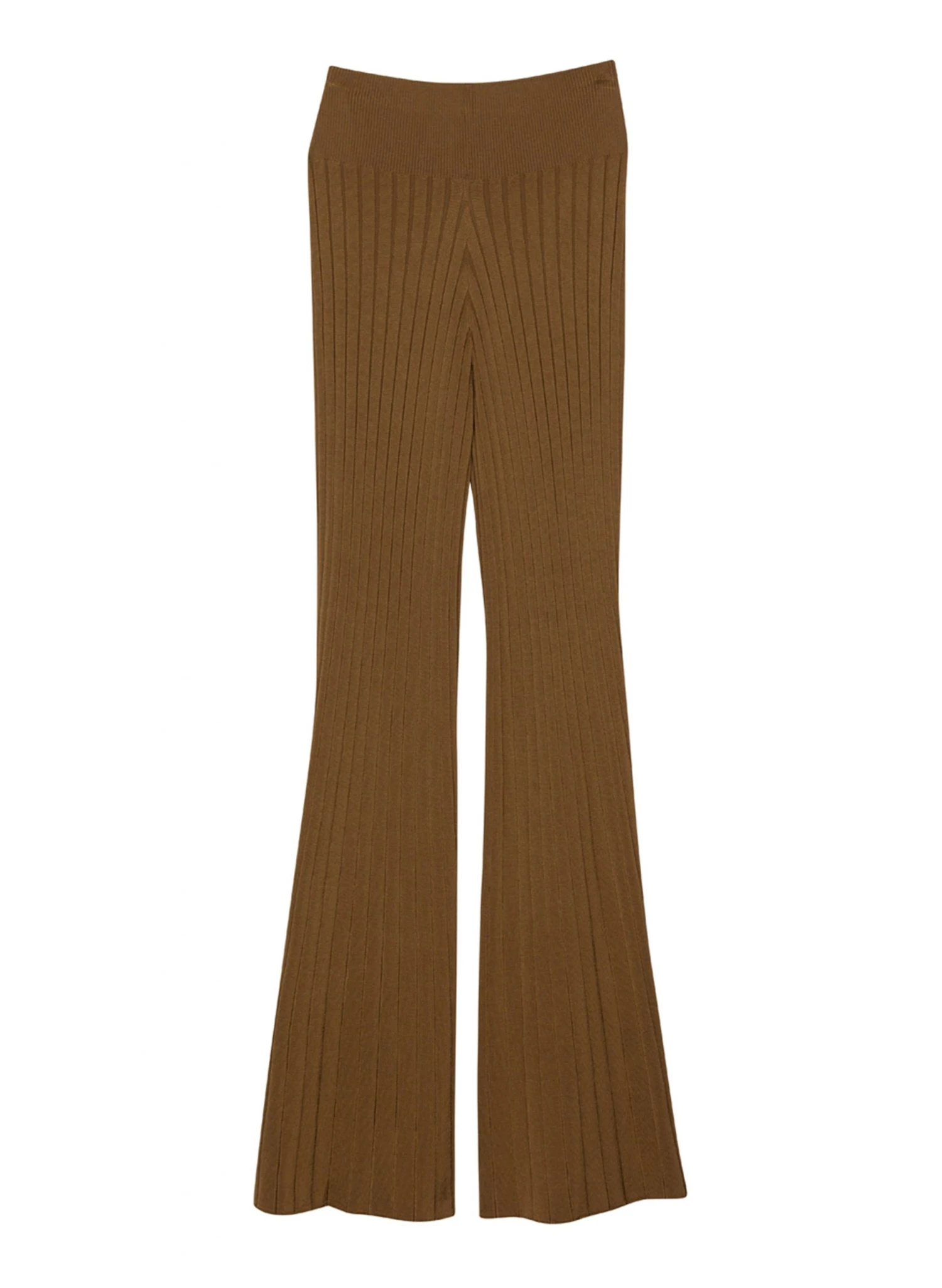 The Astrid Pant is knitted from so-soft viscose in a warm brown hue. This ribbed design features gently flared legs and a comfortable stretch waist.
