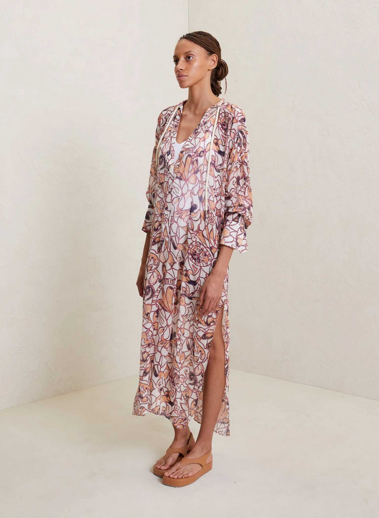 The Palma Coverup is crafted from our solid silk-linen blend in a white abstract floral print. This maxi silhouette is cut for a roomy fit, featuring a plunging V-neckline and voluminous long sleeves.