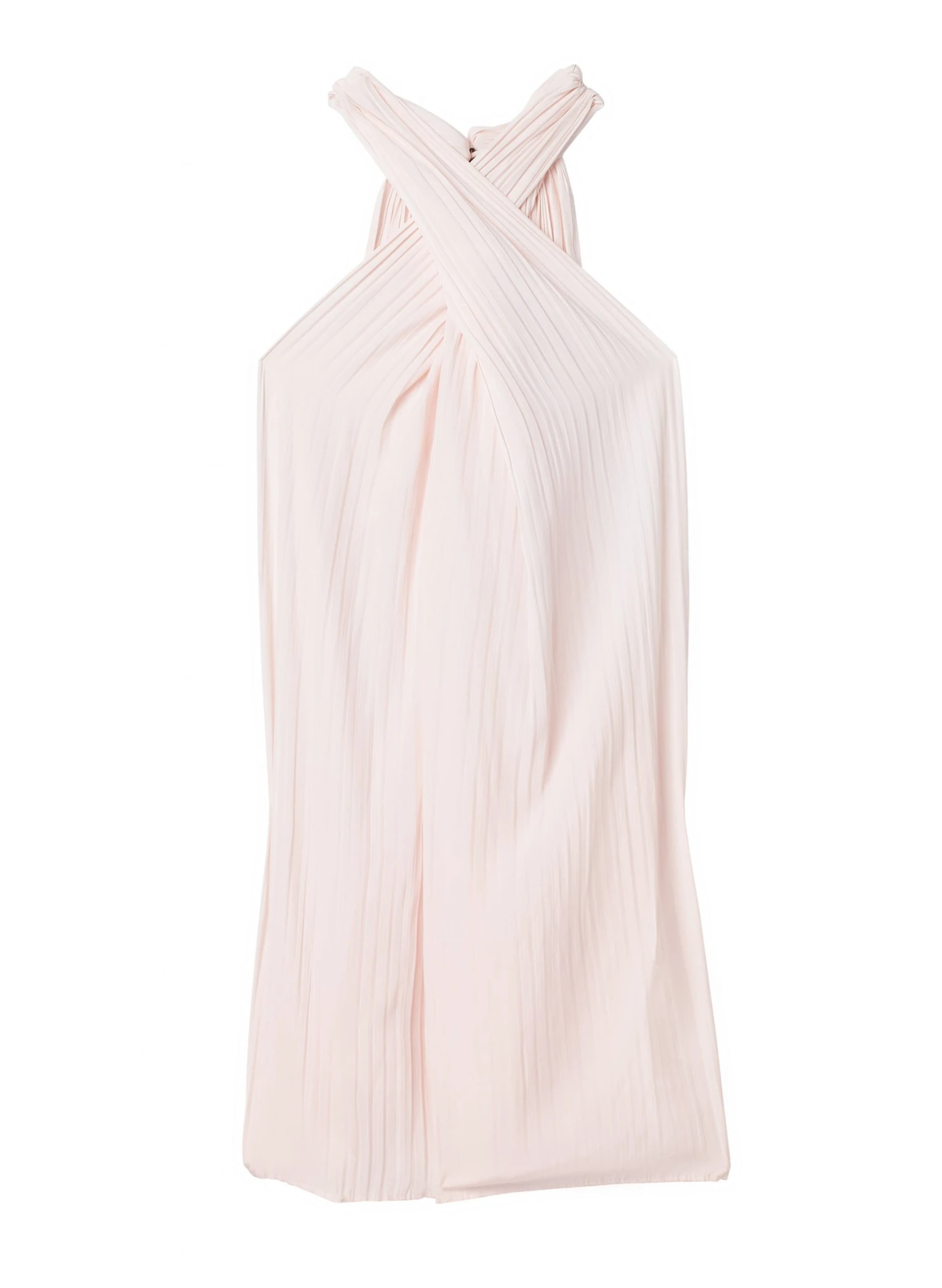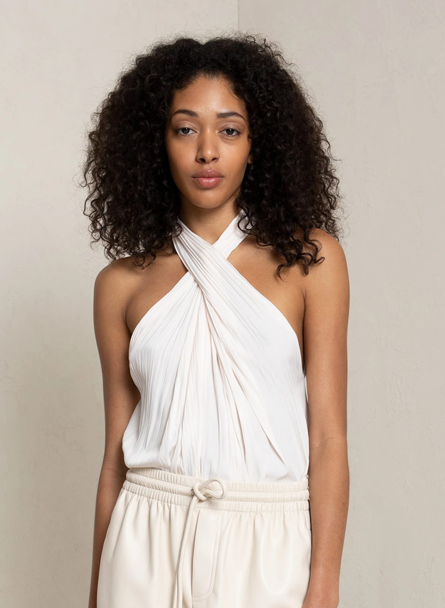 The Rio Top features beautiful pleating that sways with every step in a creamy hue. This shoulder-baring silhouette features a criss-cross halter neckline, asymmetric hemline, and keyhole back.