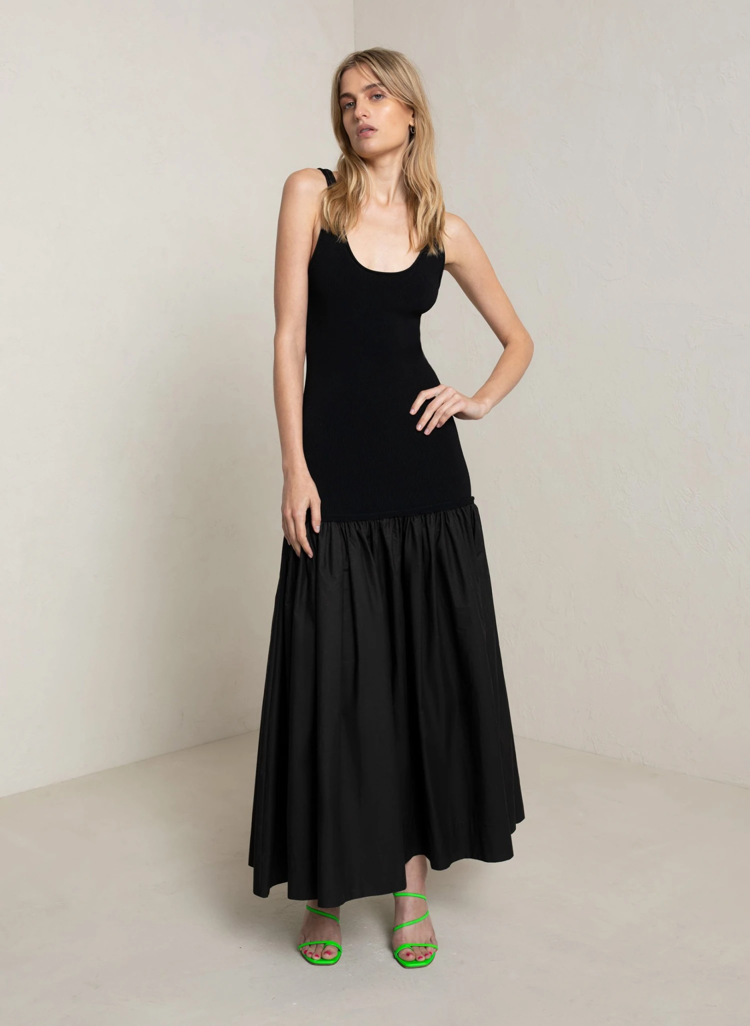 The Sadie Dress is knitted for a silhouette-skimming fit through the hips, then combined with our crisp day cotton on the bottom in wardrobe-essential black. This maxi silhouette has a scoop neckline and dropped waist for effortless impact. Shop Dresses