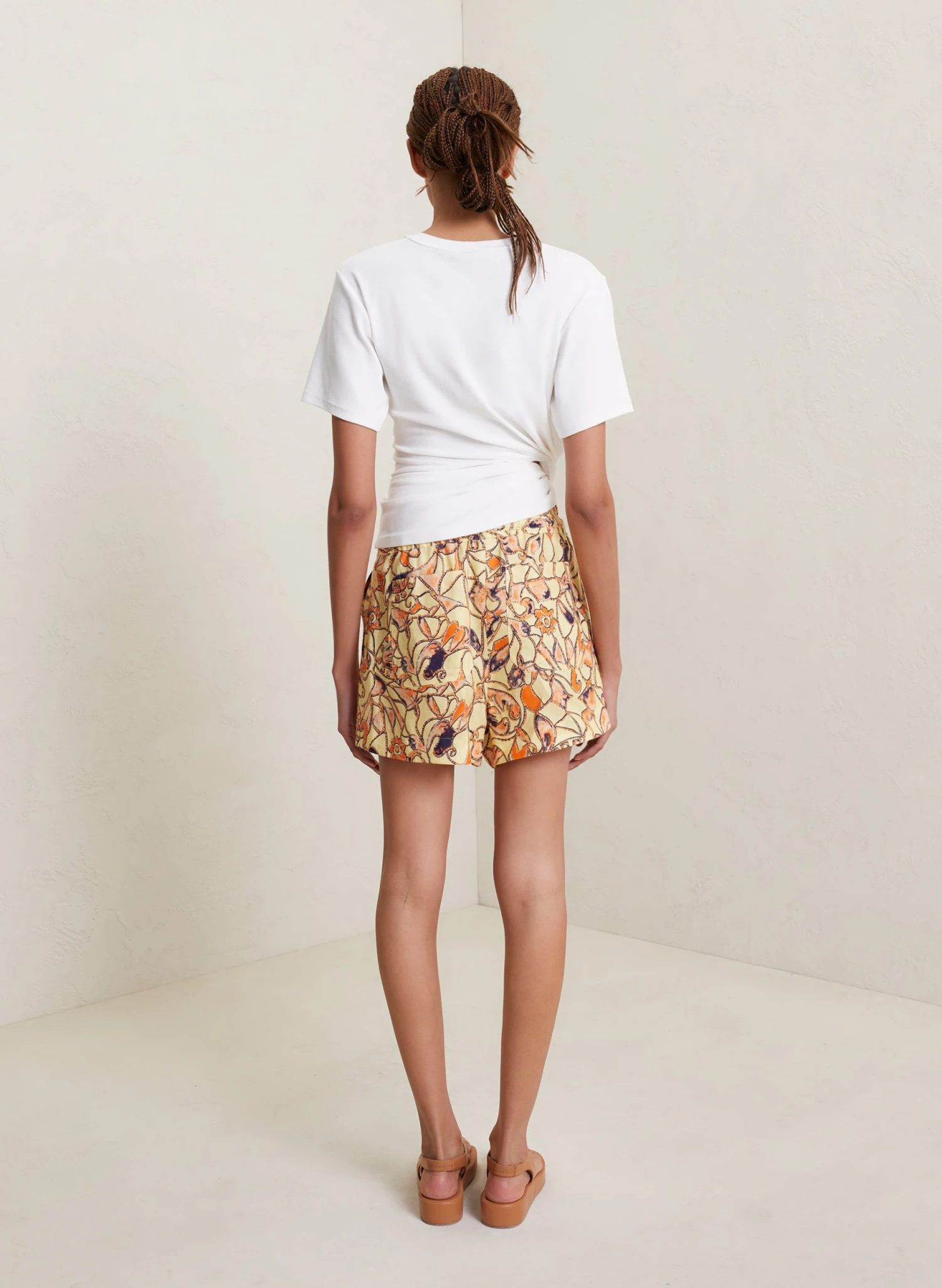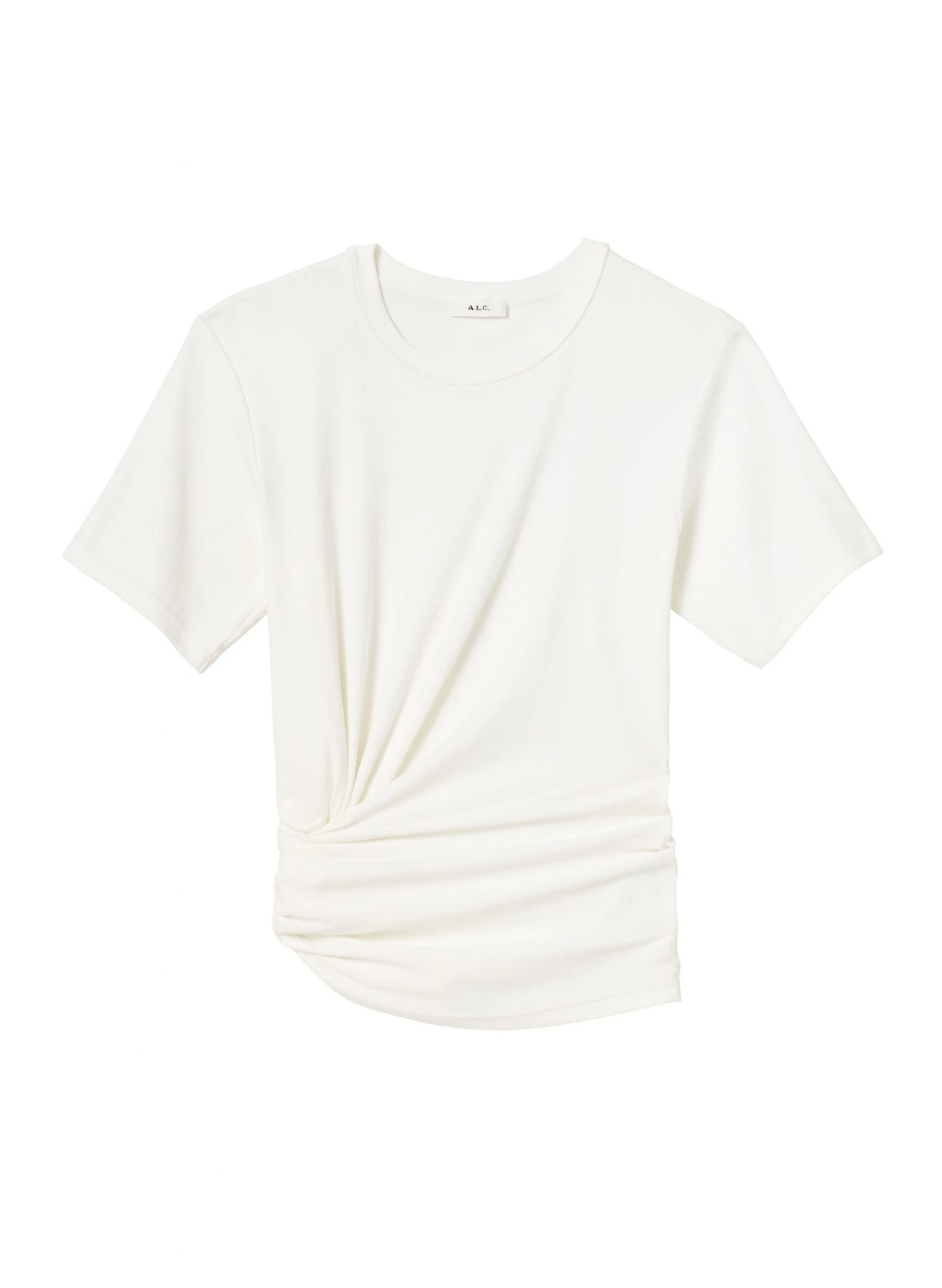 The Bridget Tee is crafted from vintage ribbed cotton in wardrobe essential white. This cropped silhouette features a round neckline and short sleeves with an asymmetric knotted detail and side cutout.