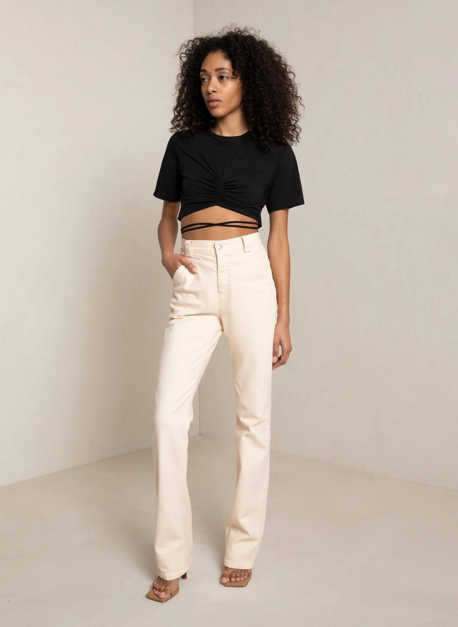 The Jane Tee is crafted from soft cotton jersey blend in wardrobe-essential black. This crewneck silhouette features short sleeves and cropped fit with ruched detailing and a tie that wraps around the waist.