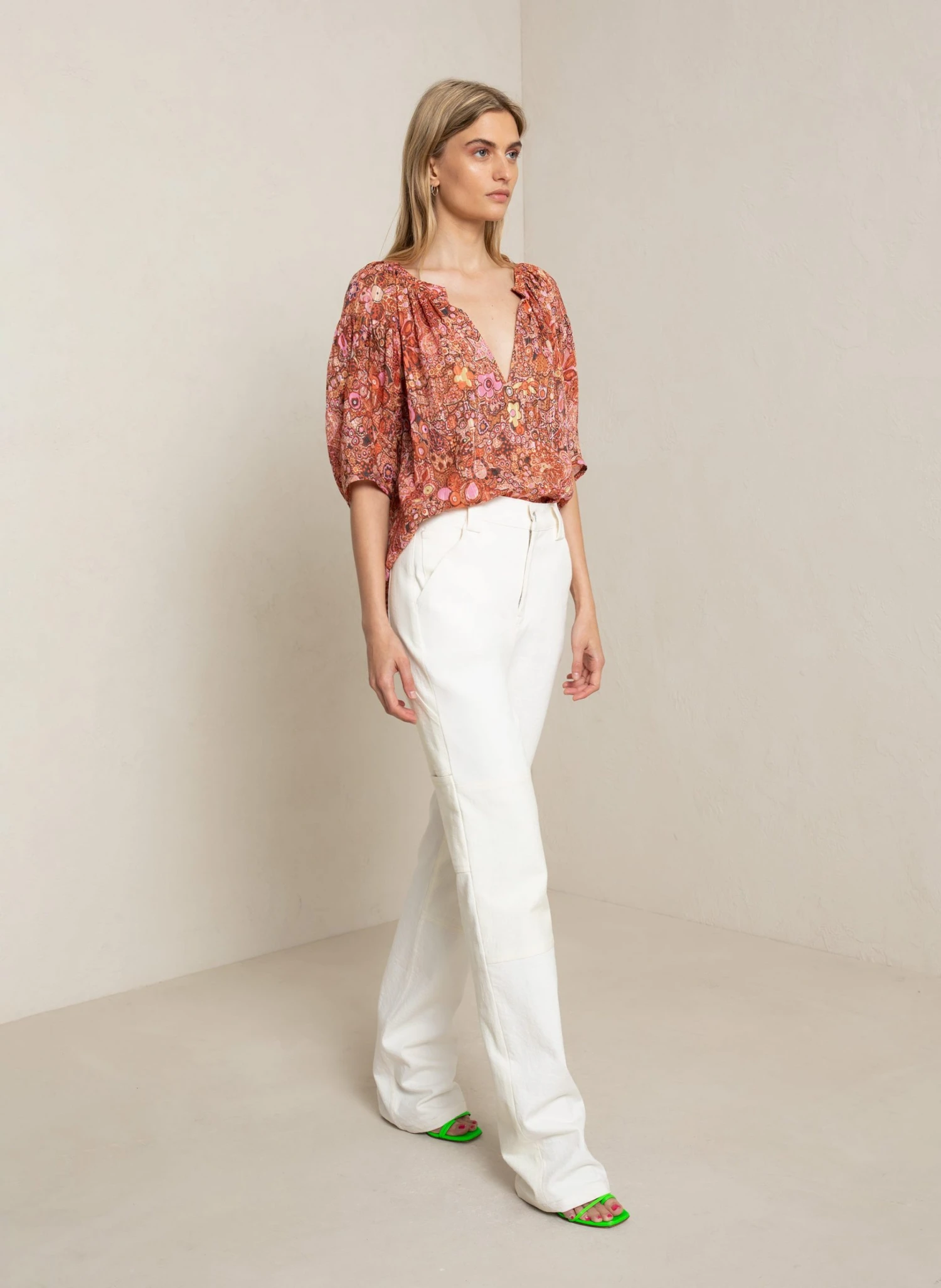 The Julianna Top is crafted in our crinkle cotton-silk blend in a retro-inspired floral print. This fluid silhouette features dropped, elbow-length puff sleeves, and a V-shaped neckline.